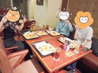 夜は海の見えるホテルでバイキングディナーを楽しみ、それぞれ好きな食べ物をお皿に揃えてお腹いっぱい食べました。